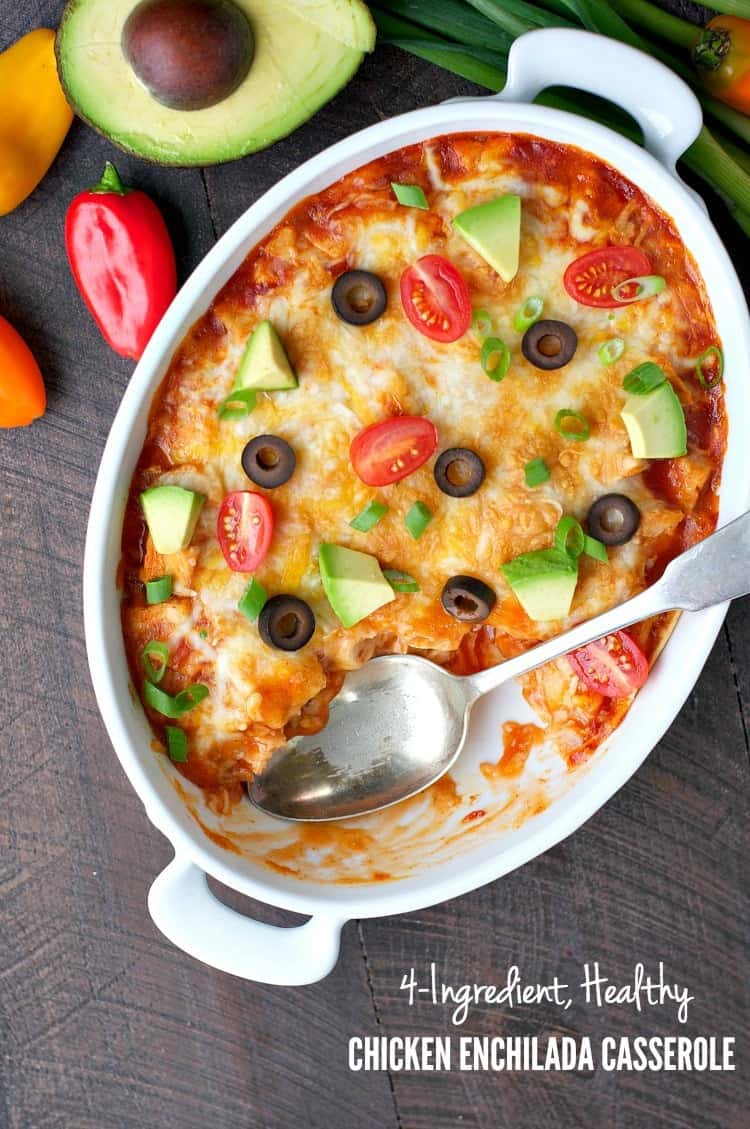 “With just four basic ingredients you can have a Healthy Chicken Enchilada Casserole ready to go in the oven — with only 5 minutes of prep time! Easy, nutritious, and family-friendly weeknight dinners don’t get any faster than this!”. Recipe: TheSeasonedMom.