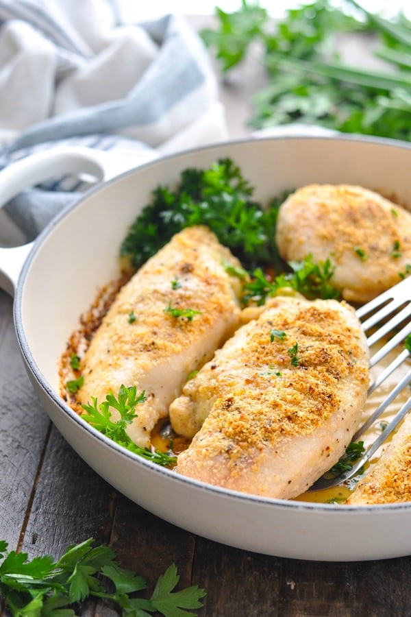 “This dump-and-bake easy Parmesan Crusted Chicken requires just 3 simple ingredients and 5 minutes of prep! It’s a perfect family-friendly, healthy, low carb dinner recipe for your busy weeknights.”. Recipe: TheSeasonedMom.