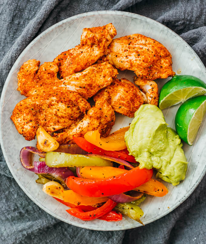 “These easy chicken fajitas are oven-baked on one sheet pan, making this recipe a breeze to cook. Chicken breasts are sliced and tossed with a homemade seasoning, then baked until tender. Completing this healthy meal are sweet and juicy vegetables like bell peppers and onions, and occasional bites of roasted browned garlic cloves.”. Recipe: SavoryTooth.