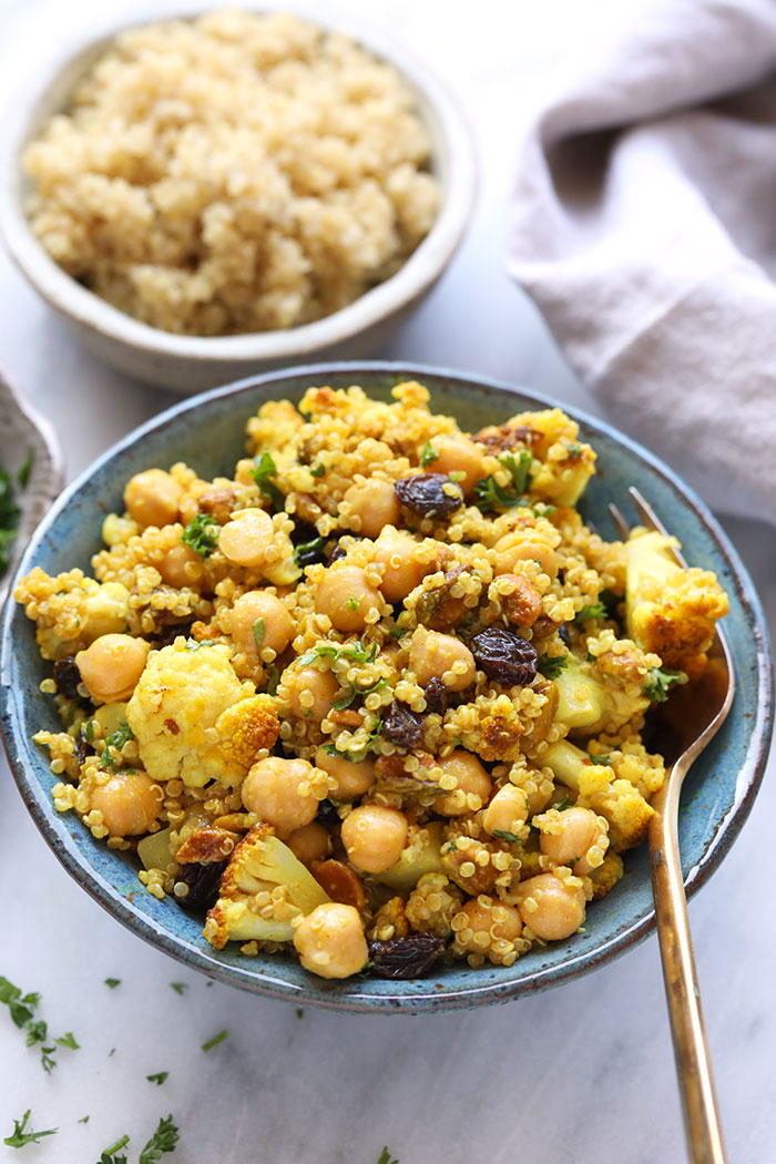 “This Golden Roasted Cauliflower and Quinoa Salad is a healthy, satisfying, and delicious salad that everyone in your family will love. It is great for a quick meal-prep lunch or a light quinoa salad for dinner. You can’t beat the savory tahini dressing with sweet raisins for the perfect sweet and savory combination!”. Recipe: FitFoodieFinds.