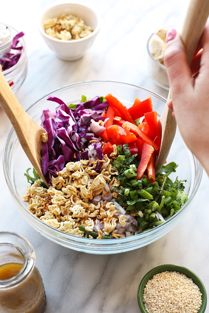 “You’re going to love this Healthy Asian Chicken Salad! It’s made with delicious raw vegetables, a homemade Asian vinaigrette, and crunchy ramen for the perfect mixture of textures and flavor.”. Recipe: FitFoodieFinds.