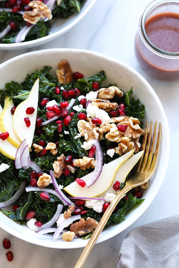 “A flavorful Pomegranate Salad made with massaged kale, a homemade pomegranate salad dressing, and amazing toppings >> fresh pomegranate arils, pear slices, walnuts, and goat cheese.”. Recipe: FitFoodieFinds.