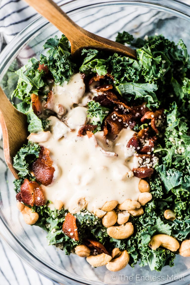 “Bacon Kale Caesar Salad is the best way to eat lots of kale. This grain-free and paleo caesar includes crispy bacon and toasted cashews instead of croutons, which gives it crunch and tons of flavor. It’s easy to make, healthy, and delicious!”. Recipe: TheEndlessMeal.