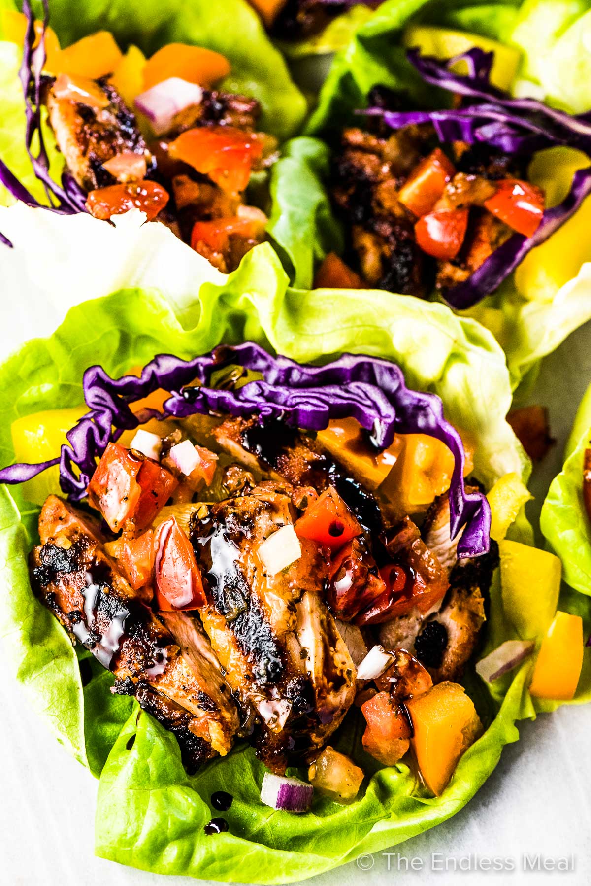 “Bruschetta Chicken Lettuce Wraps are the ultimate easy and delicious summer dinner recipe. Chicken thighs are seasoned, grilled, chopped then put into lettuce wraps and topped with bruschetta and drizzled with sweet reduced balsamic vinegar. It’s a healthy recipe that will please everyone at your table!”. Recipe: TheEndlessMeal.
