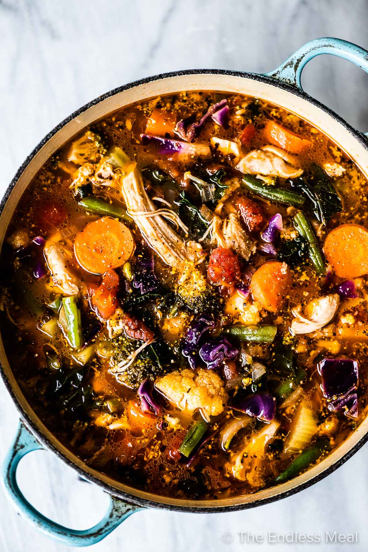 “This chicken vegetable soup is loaded with shredded chicken and tons of healthy veggies. We use bone-in chicken which gives the savory tomato broth tons of flavor. It’s a warm and cozy chicken soup recipe that the whole family will love!”. Recipe: TheEndlessMeal.
