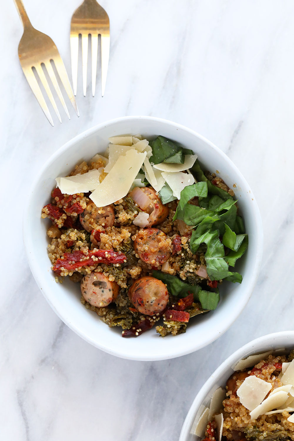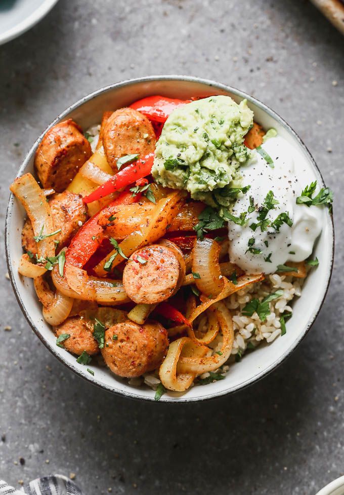 “If you’re looking for a healthy, fast, flavorful dinner, look no further than Sheet Pan Fajita Bowls with Chicken Sausage. These hearty bowls are packed with chewy brown rice, crispy al fresco chicken sausage, sweet peppers, and served with smashed avocado and Greek yogurt. Perfect for busy weeknights! “. Recipe: CookingForKeeps.