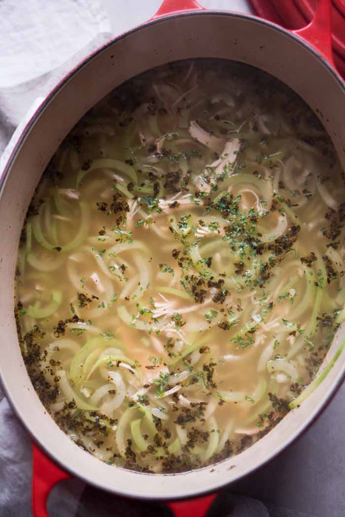 “Chayote chicken noodle soup, aka one of the best soups I’ve ever made. The taste and texture are so spot on with traditional homemade chicken noodle soup; you won’t even miss your carb-loaded comfort food. Whether you’re simply craving a cozy, homey soup, need a quick family-friendly keto meal, or nursing a cold without carbs, this chicken soup with chayote noodles will definitely hit the spot!”. Recipe: Ketogasm.