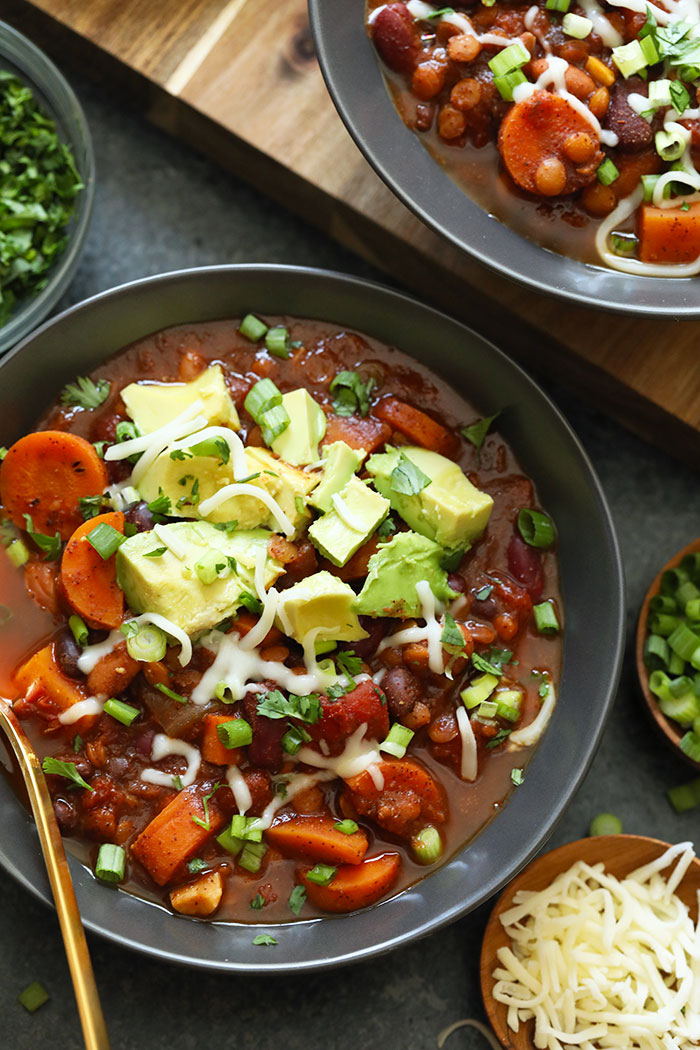“Instant Pot Vegetarian Chili is an easy weeknight meal packed with fiber from lentils and beans, as well as delicious veggies like carrots and sweet potatoes.”. Recipe: FitFoodieFinds.