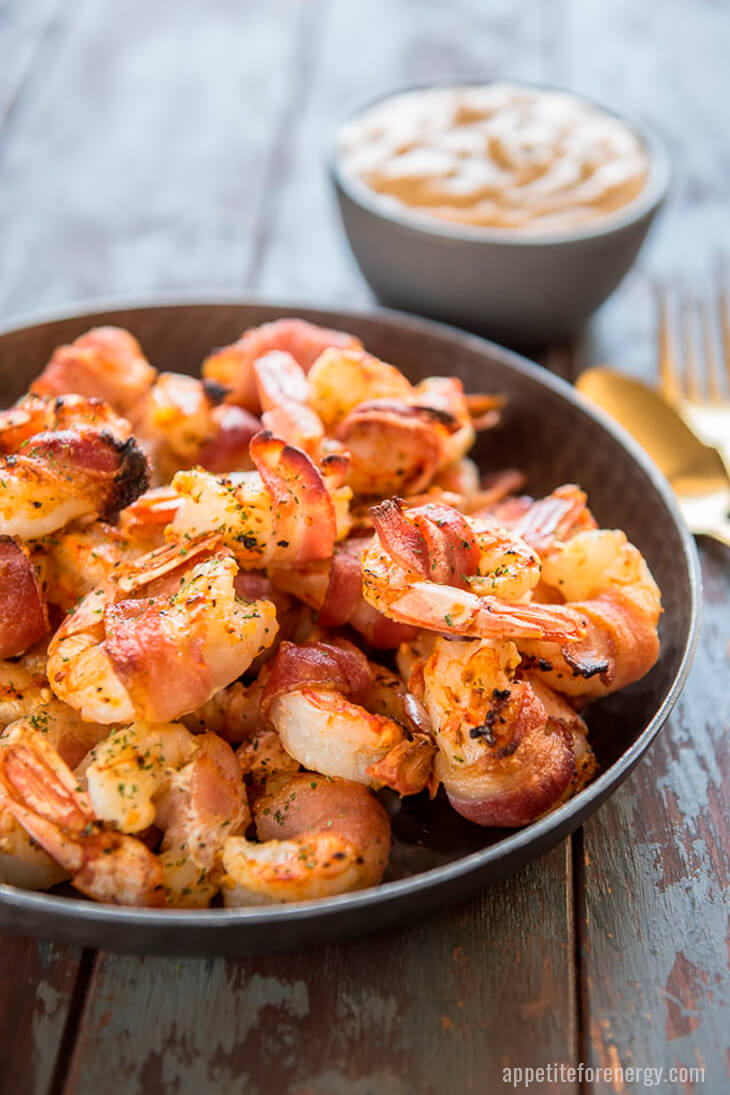 “Bacon wrapped shrimp makes an easy low-carb 30-minute family dinner or a great appetizer for guests. Dip your shrimp into zingy remoulade sauce for a bite-sized flavor explosion!”. Recipe: AppetiteForEnergy.