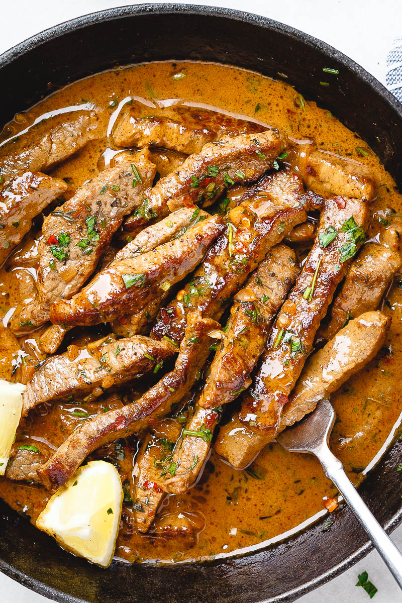 “Pan-Seared Steak in Butter Sauce – Hyper simple and so flavorful! Who can resist a juicy steak, especially when it’s coated with a silky butter sauce reduction? Steak strips are marinated then quickly seared in a cast iron pan; the brown bits providing the basis for the most delish sauce ever. Dinner is ready!”. Recipe: EatWell101.