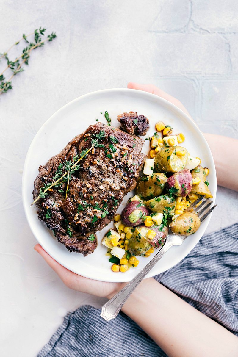 “Delicious garlic butter skillet steak with a tangy and delicious potato & corn salad”. Recipe: ChelseasMessyApron.