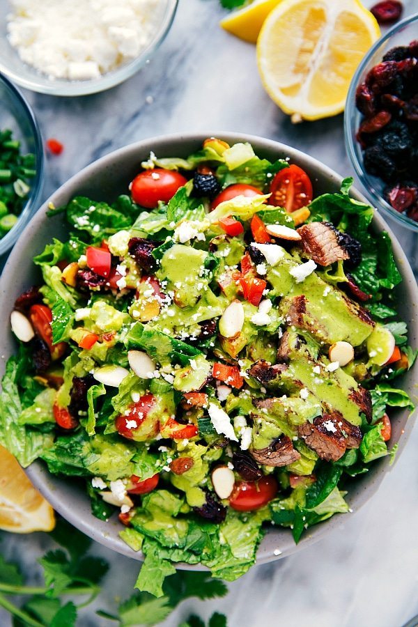 “A delicious tri-tip steak OR chicken salad with cherry tomatoes, dried cherries, toasted almonds, red pepper, and a delicious healthy lemon cilantro vinaigrette.”. Recipe: ChelseasMessyApron.