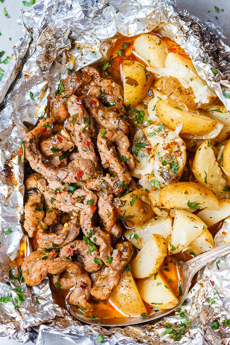 “Garlic Herb Steak and Potato Foil Packs – DELICIOUS Steak and potatoes seasoned with garlic and herbs and cooked inside foil packets. They can be cooked on the grill OR in the oven, and are perfect for a family dinner or a backyard get-together.”. Recipe: Diethood.