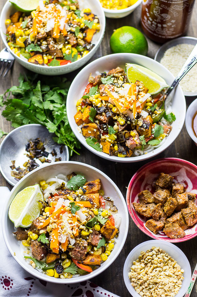 “These Lemongrass Steak Noodle Bowls are full of veggies like roasted sweet potatoes, corn, crispy shallots and sauteed bell peppers. Served overtop of rice noodles and garnished with pickled carrots and daikon radish, these bowls are going to become your next go-to weeknight meal!”. Recipe: TheGirlOnBloor.