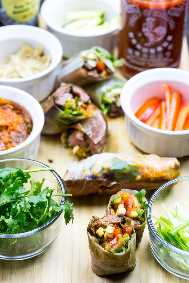 “These Steak and Kimchi Summer Rolls are a delicious spin on Vietnamese fresh spring rolls made with rice paper wraps and filled with medium-rare sirloin, enoki mushrooms, kimchi and fresh herbs. They’re a fantastic appetizer idea!”. Recipe: TheGirlOnBloor.