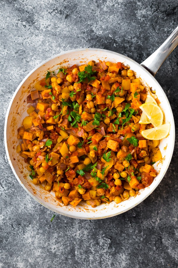 “Vegan Moroccan chickpea skillet is freezer-friendly and perfect for meal prep! With chickpeas, sweet potatoes and spicy Moroccan seasoning.” Recipe: SweetPeasAndSaffron.