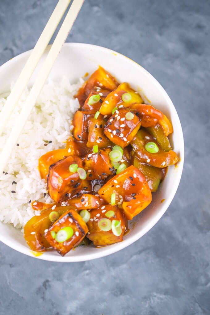 “Crispy (breaded or plain) tofu is drizzled in a tangy sriracha sweet and sour sauce with peppers and garlic to make this delicious, better-than-takeout spicy sweet and sour tofu!” Recipe: YupItsVegan.