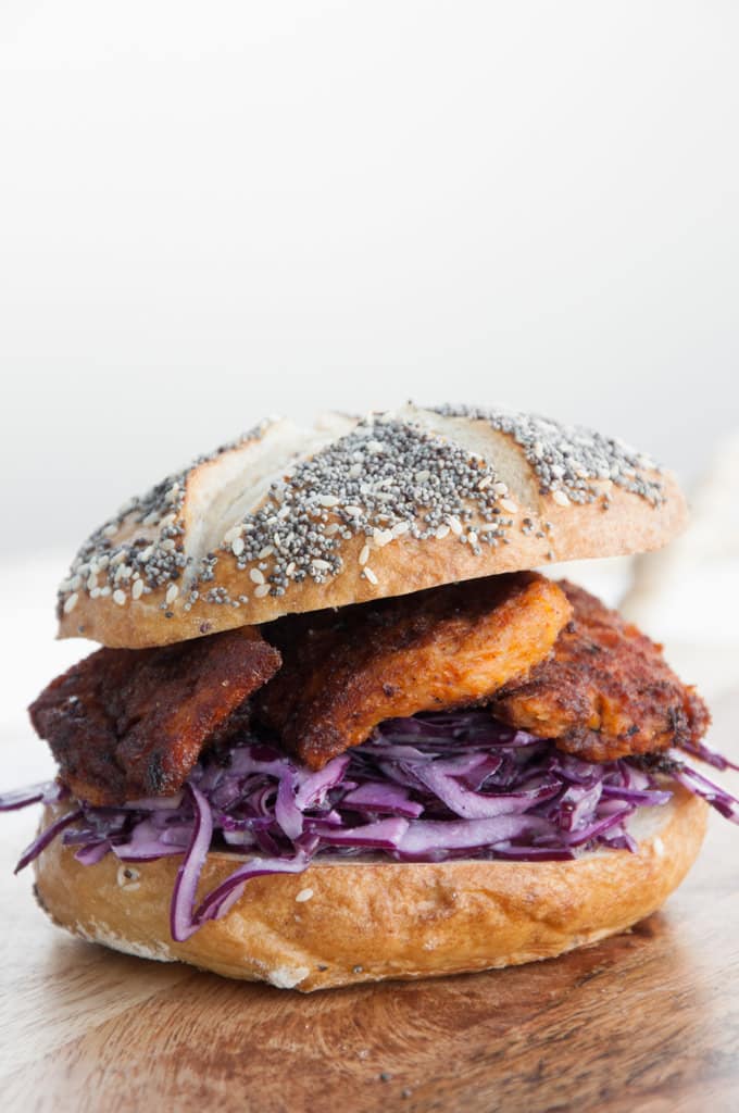“Burger time is here! Remember the Garlic Slaw I posted a couple of days ago? Turns out, it’s delicious in a burger as well – especially together with TVP (Textured Vegetable Protein) “chicken style” slices. The crunchy garlic slaw and the soft, well seasoned TVP slices go well together. Put that all in a homemade pretzel bun topped with seeds and I’m in heaven!” Recipe: ElephantasticVegan.