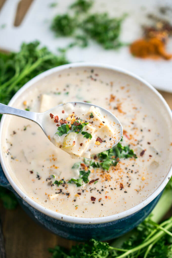 “Creamy vegan chowder, made vegetarian and clam-free with some sneaky protein ingredients. And, made dairy-free with my famous creamy soup base. Bonus… this vegan clam chowder is totally mushroom-free.” Recipe: YupItsVegan.