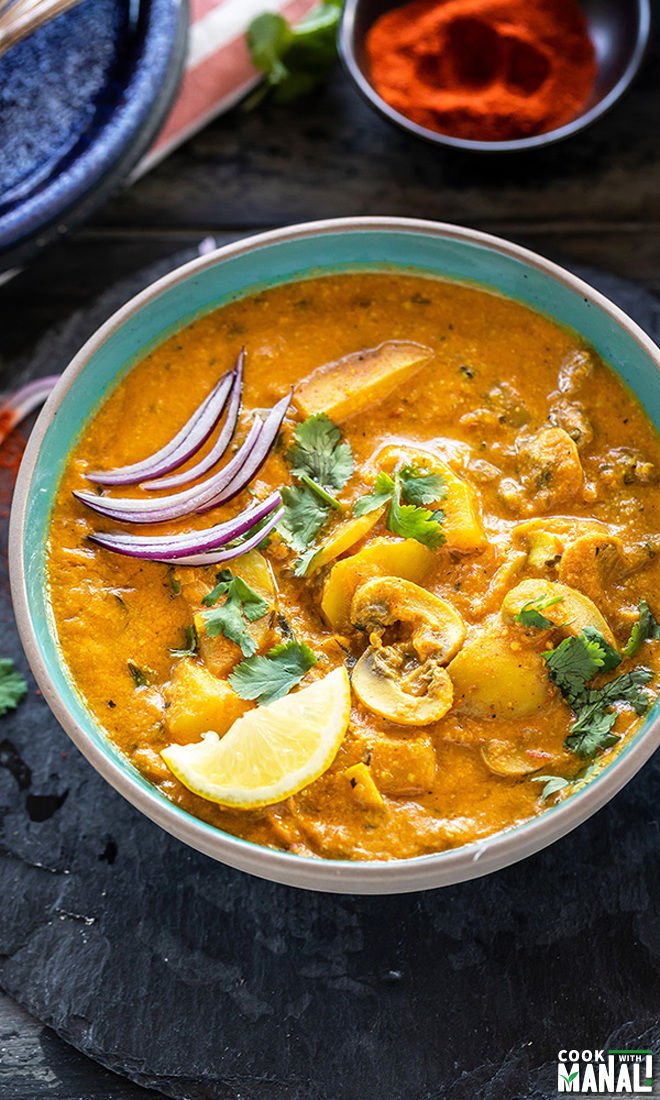 “Aloo Mushroom Masala – one pot, easy & creamy curry made with potatoes & mushrooms. It is wonderfully spiced, flavorful and makes a great vegan and gluten-free meal.”. Recipe: CookWithManali.