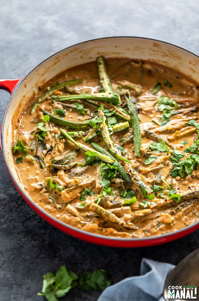 “Bhindi (okra) is a spicy and tangy curry made with peanuts, sesame and tamarind! This Bagara bhindi is great with naan or rice and is also vegan.”. Recipe: CookWithManali.