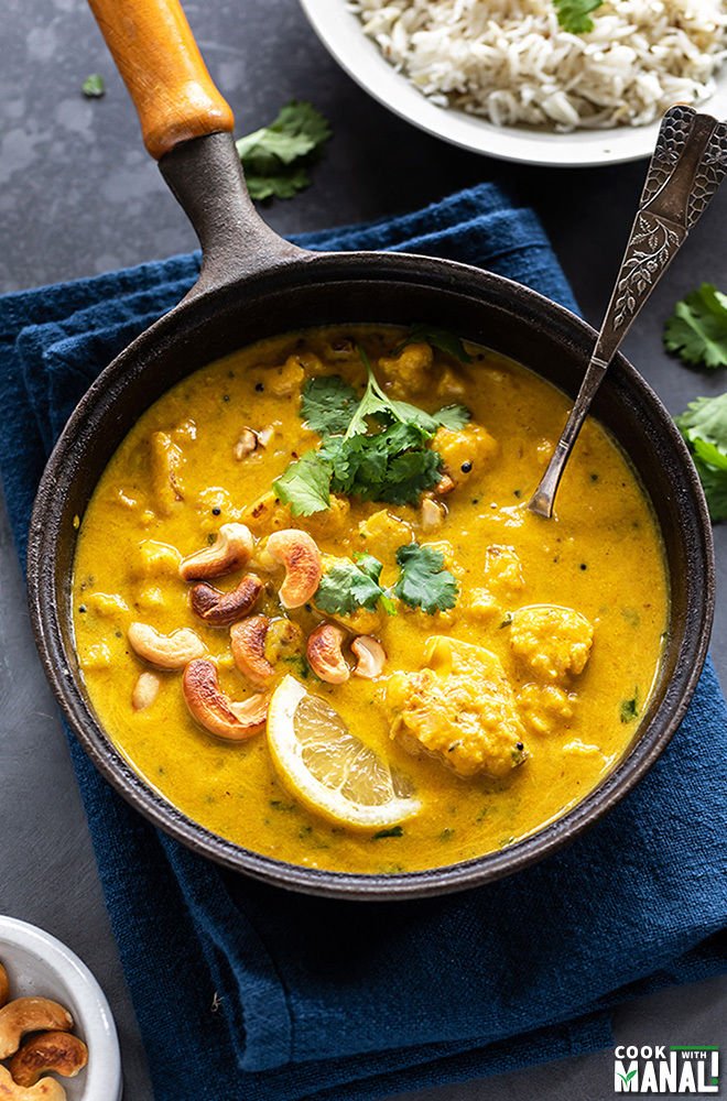 “Use the fresh sweet mangoes in season to make this Cauliflower Cashew Mango Curry! It’s has the sweetness of mangoes, the creaminess of coconut milk and the crunch from cashews. This might well be your new favorite curry.”. Recipe: CookWithManali.
