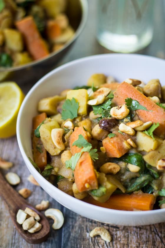 “Spiced potatoes, chickpeas and carrots are simmered in a savory vegetable broth with spinach and plump raisins. Toasted cashews and fresh lemon juice add crunch and freshness to this hearty meal!”. Recipe: TheWanderlustKitchen.