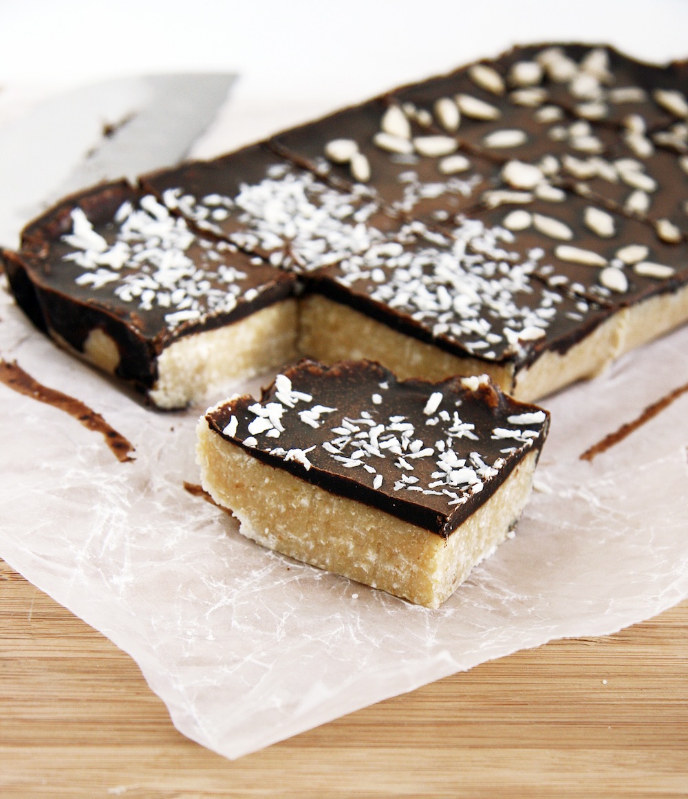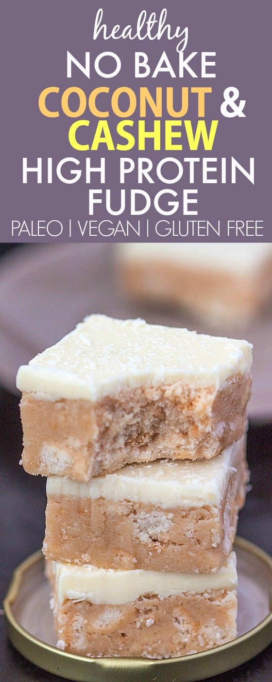 “Inspired and similar to my favourite No Bake Cashew Coconut Protein bars, this Paleo No Bake Coconut Cashew Protein fudge looks impressive but really- It’s quick and easy to whip up. The base is made from just four key ingredients (five if you include a sweetener)- Coconut flour, chopped cashews, protein powder and a liquid of choice (I used cartoned coconut milk)”. Recipe from TheBigMansWorld.