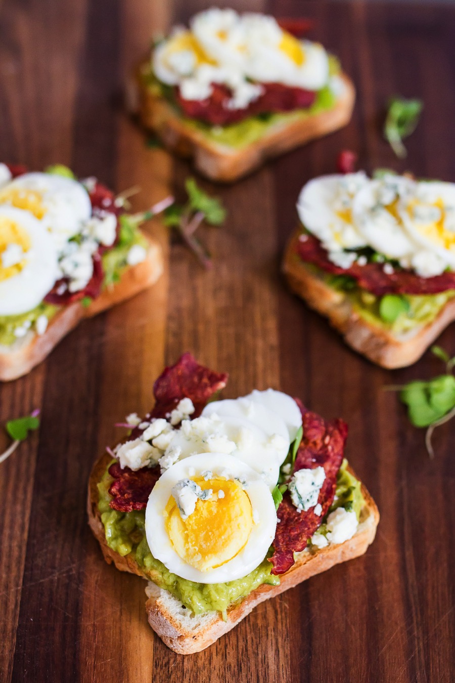 “Turn toast into lunch with this veggie-packed cobb salad avocado toast — loaded with hard boiled egg, turkey bacon, blue cheese and micro greens.” Recipe from EatingBirdFood.
