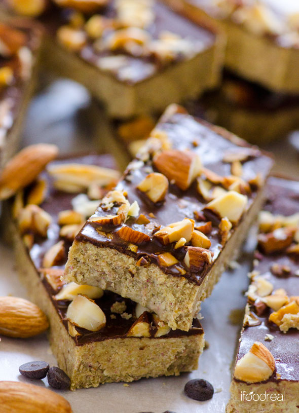 “10 minutes, 6 ingredients and no baking required for these delicious and crunchy protein bars! Only 2 g of sugar, 5 g of carbs, vegan & gluten free.” Recipe from ifoodreal.com.