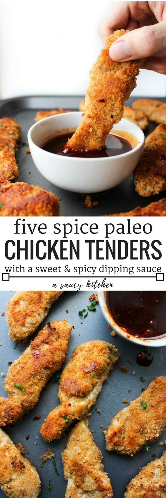 “Paleo Chicken Tenders crusted in a almond flour blend and mixed with Chinese five spice with a sweet & spicy Asian dipping sauce | Gluten Free + Dairy Free + Low FODMAP option” Recipe: asaucykitchen.com