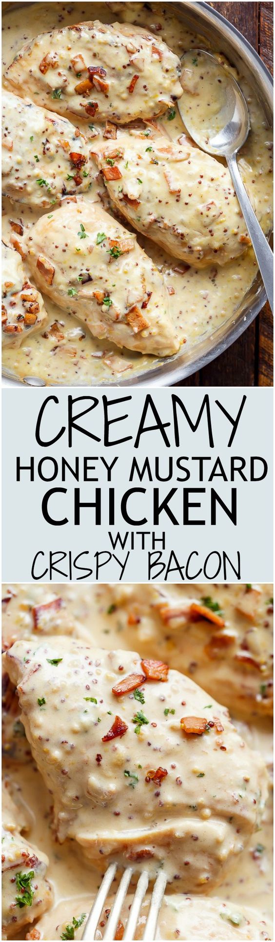 “A deliciously Creamy Honey Mustard Chicken with crispy bacon pieces will become your new favourite dinner — WITH dairy free options!” Recipe: cafedelites.com