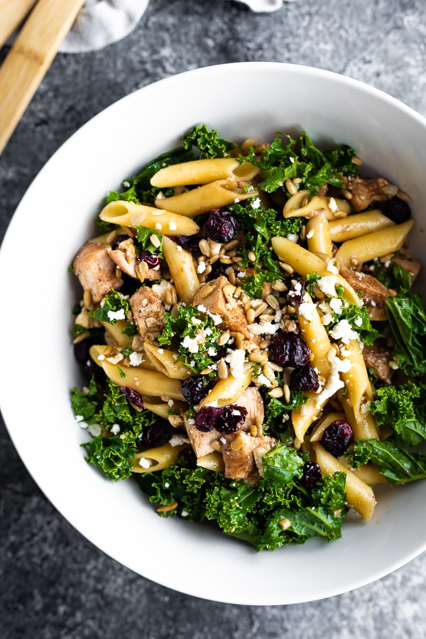 “Kale chicken pasta salad with a tangy balsamic vinaigrette, sunflower seeds and dried cranberries. Works great for meal prep or a weeknight dinner.” Recipe: SweetPeasAndSaffron.