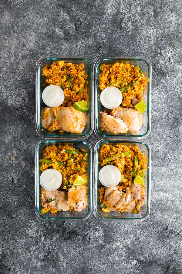 “This Sheet Pan Rosemary Chicken is a healthy, low-carb chicken meal prep idea that is perfect as a 30-minute dinner or to pack up as weekly lunch bowls!” Recipe: TheGirlOnBloor.