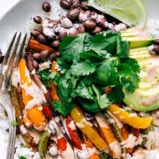 “These Honey Lime Chicken Enchilada Stuffed Peppers can be made with or without meat – all with simple pantry ingredients and minimal prep!” Recipe: LayersOfHappiness.