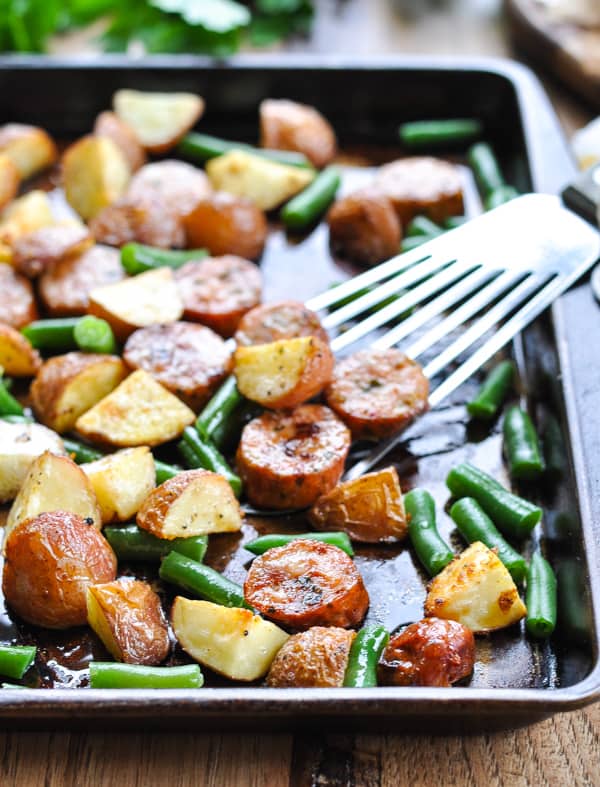 “An entire dinner that cooks on one tray for a fast, nutritious, and delicious weeknight dinner! This Sheet Pan Supper is loaded with Italian sausage, tender green beans, and crispy oven-roasted potatoes. The best part? Minimal dishes to wash at the end…”. Recipe: TheSeasonedMom.