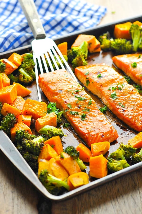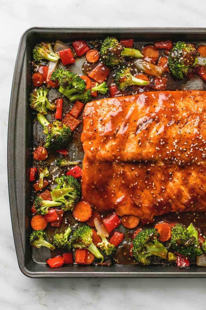 “Easy and healthy One Pan Baked Teriyaki Salmon and Vegetables is a quick, 30-minute meal chock full of hearty vegetables and topped with a tasty homemade teriyaki sauce.”. Recipe: LeCremeDeLaCrumb.