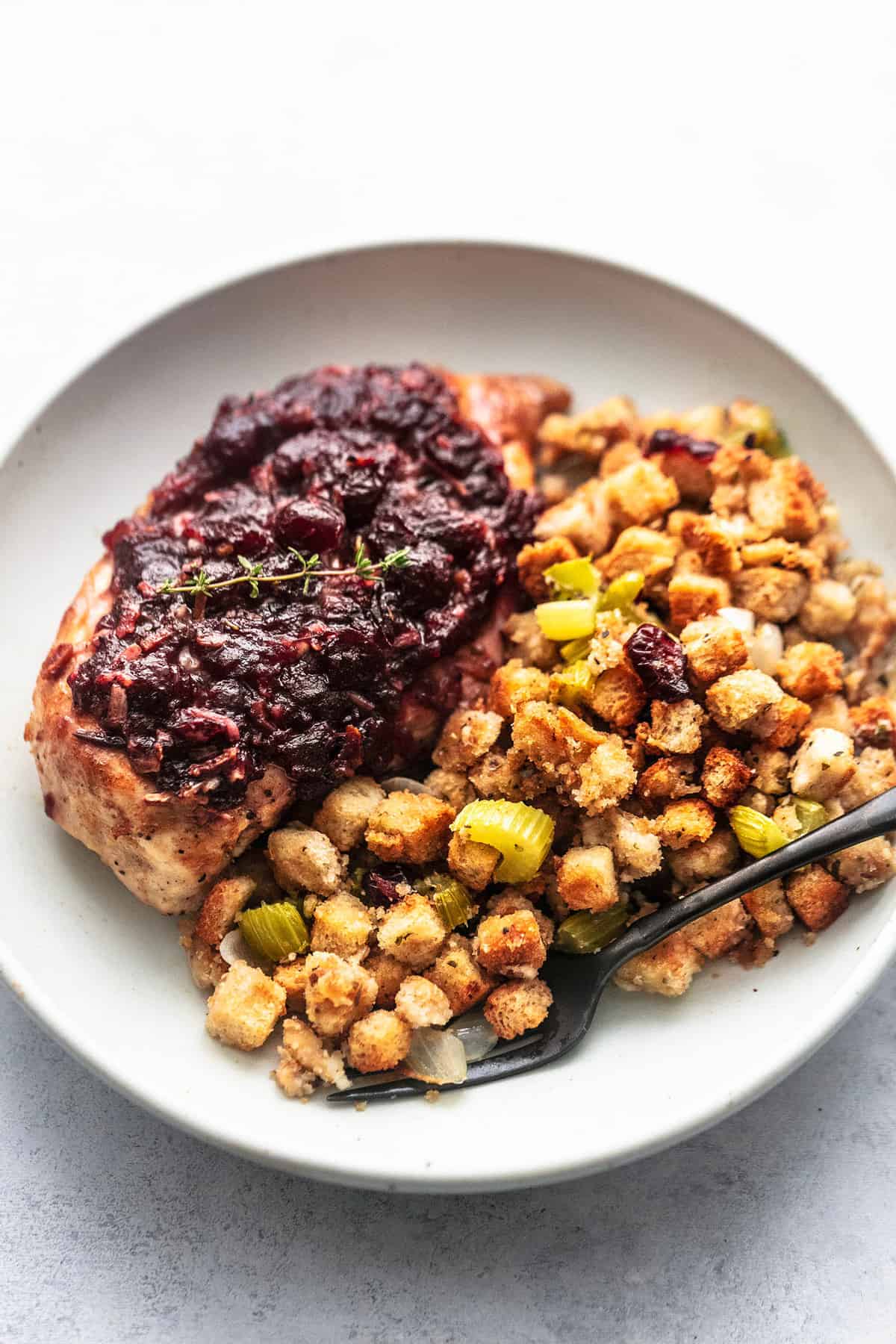 “Sheet Pan Cranberry Chicken and Stuffing is a one-dish, delicious alternative to roasted turkey and stuffing. This meal contains all the holiday flavors you love — juicy, tender, perfectly baked poultry topped with a tangy cranberry sauce and buttery, savory stuffing — made in a fraction of the time. “. Recipe: LaCremeDeLaCrumb.