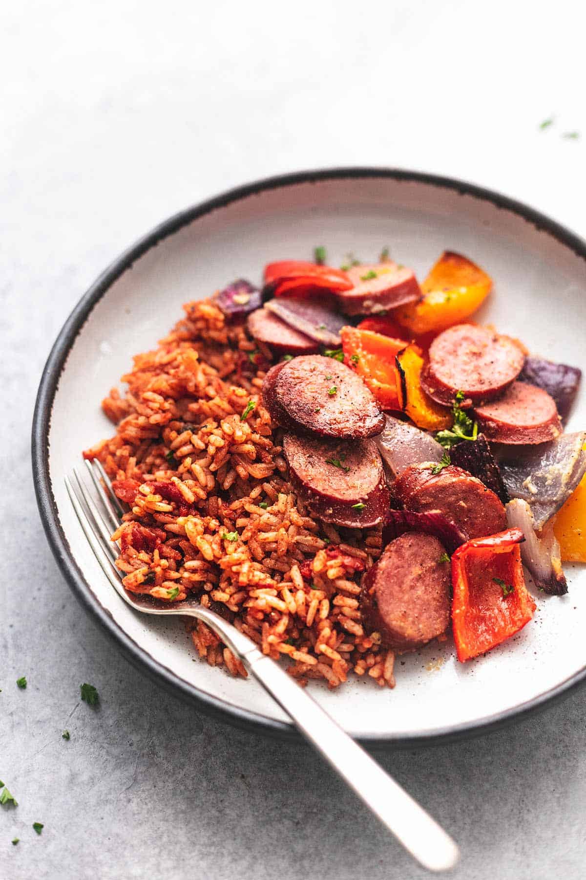 “Sheet Pan Sausage and Veggies with Spanish Rice is a healthy recipe you can bake up in one pan for easy cleaning. Using a box of Spanish rice makes this dish even easier, just add turkey sausage, peppers, onions, and spices. “. Recipe: LaCremeDeLaCrumb.