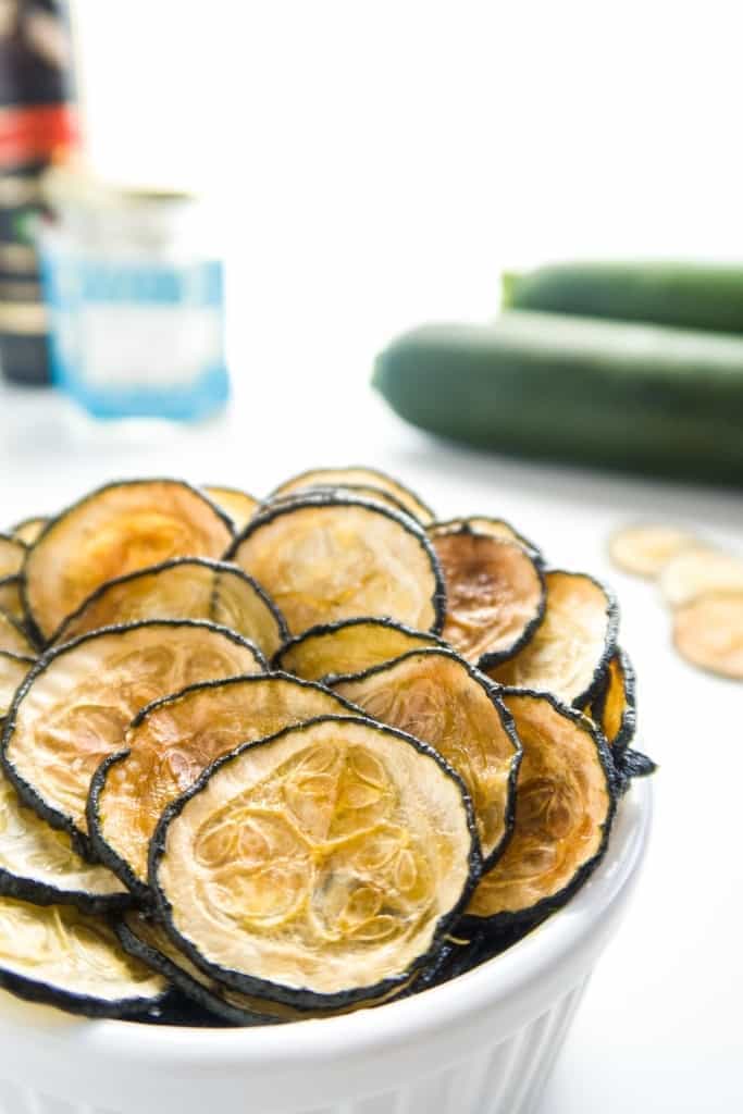 “See how to make zucchini chips in the oven OR dehydrator, with just 3 ingredients! This healthy baked zucchini chips recipe is so EASY! Low carb, keto, gf, and paleo, too.”. Recipe: WholesomeYum.