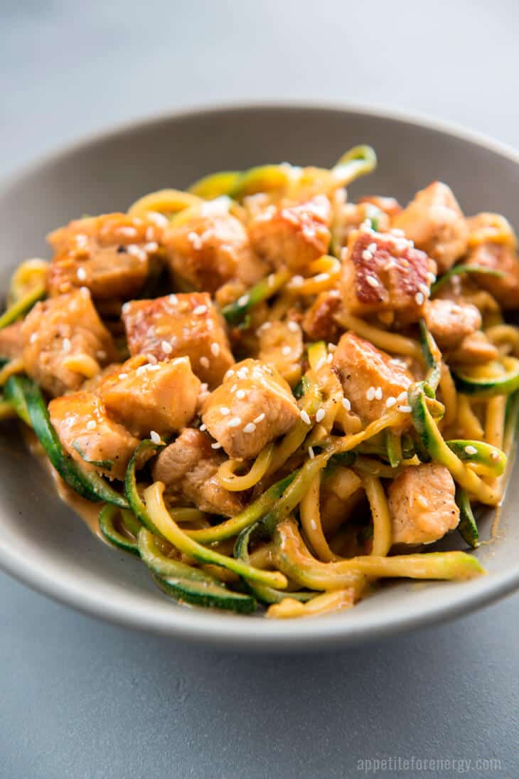 “Crispy Keto Pork Lo Mein drizzled with a punchy satay sauce and served over Zoodles is the easiest keto weeknight dinner you’ll find. You’ll love this crazy delicious, family-friendly Chinese recipe that cooks in 30-minutes flat.”. Recipe: AppetiteForEnergy.