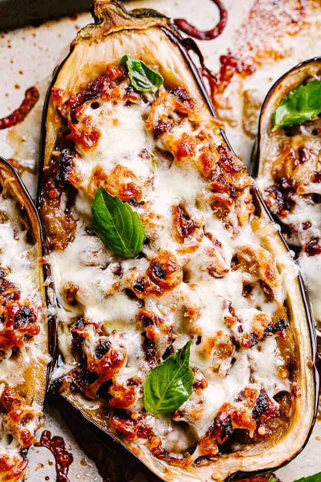 “These sausage stuffed eggplant boats are as tasty as they are fun to eat. Stuffed with spicy sausage and topped with cheese, this baked eggplant recipe is a satisfying, healthy dinner you’ll go back to again and again.”. Recipe: DietHood.