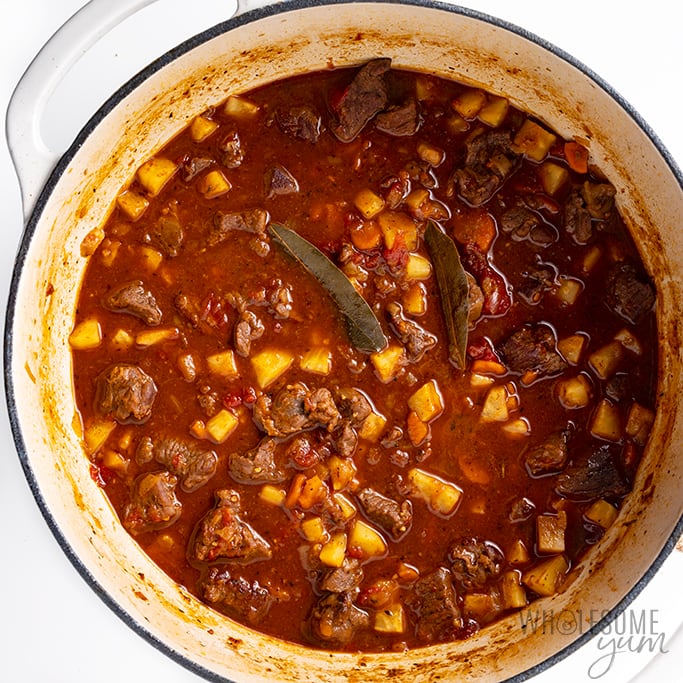 “This easy keto beef stew recipe takes just 10 minutes to prep, with a secret ingredient that tastes like potatoes. Low carb beef stew is rich and hearty – without the carbs!”. Recipe: WholesomeYum.