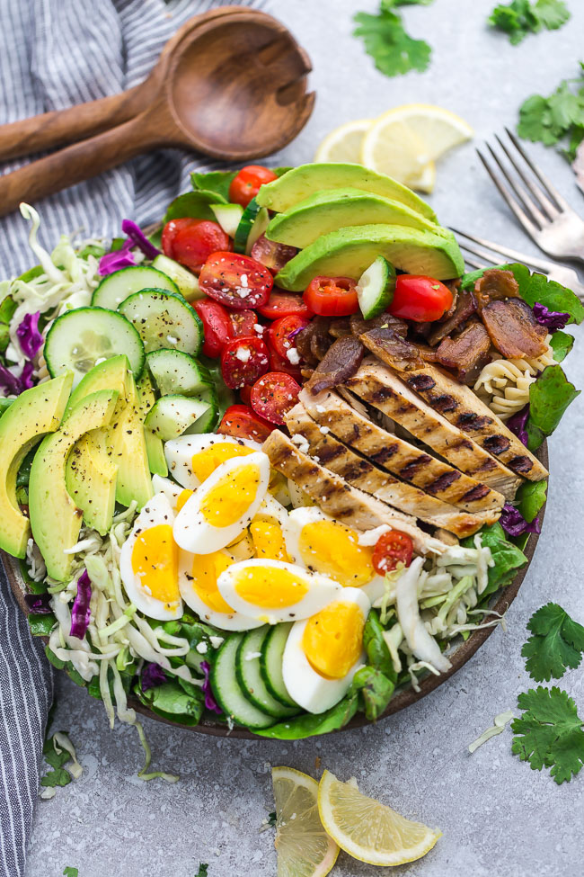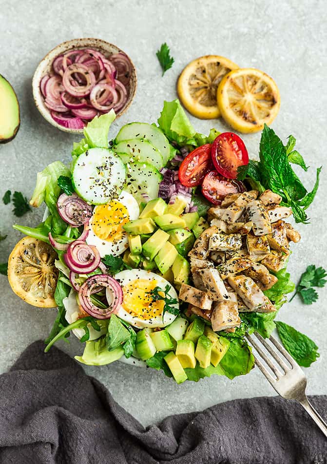 “This Cobb Salad is easy to make with everything you love about the classic American Cobb salad. It’s the perfect low carb keto lunch with lettuce, tomatoes, bacon, roast chicken breast, hard boiled eggs, avocado and a tangy and flavorful vinaigrette.”. Recipe: LifeMadeSweeter.
