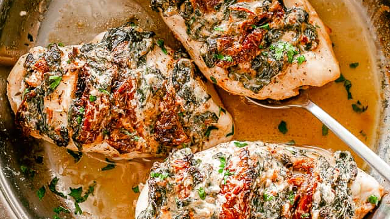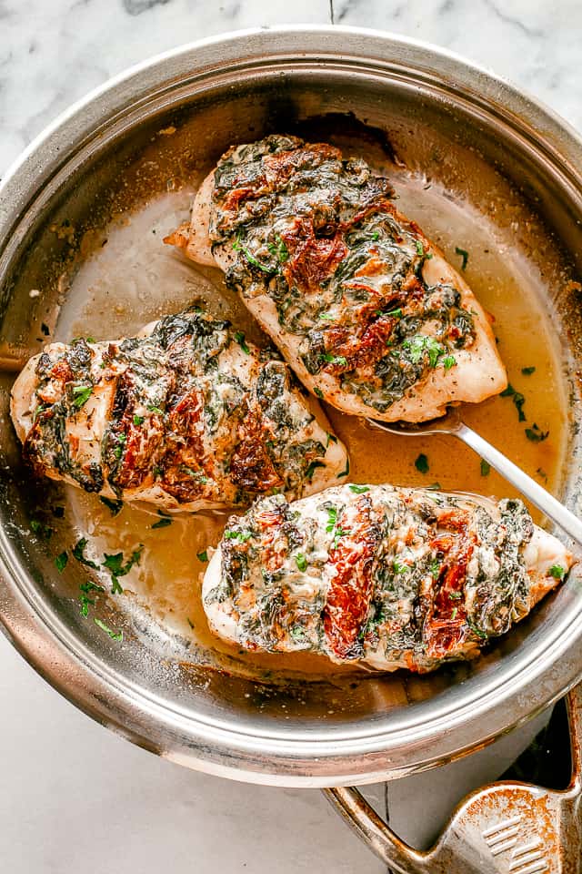 “One-Pan Cream Chicken and Spinach is a comforting creamy chicken dinner with sun-dried tomatoes and spinach. This easy Italian dinner is done in 20 minutes and all in one-pan so you don’t have to do dishes! Not to mention it is Keto-friendly.”. Recipe: The-Girl-Who-Ate-Everything.