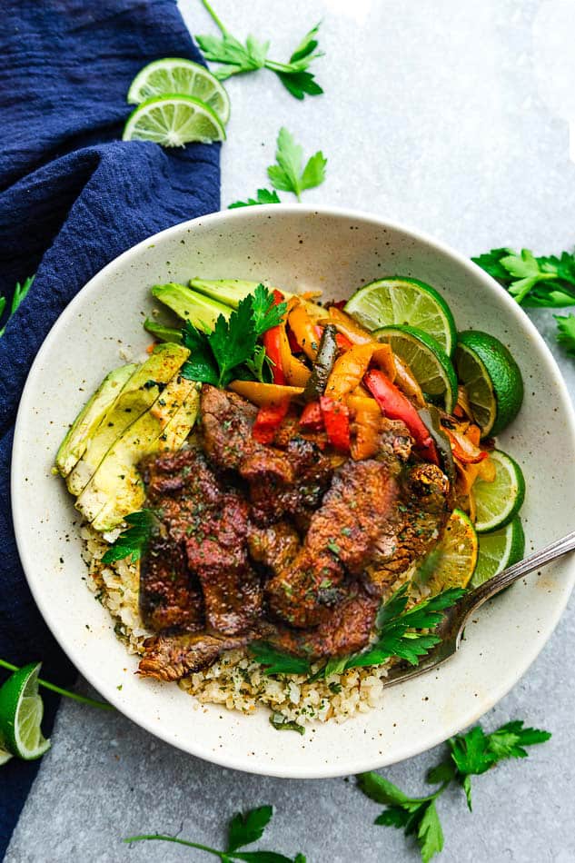 “Steak Burrito Bowls are an easy and flavorful low carb meal perfect for busy weeknights. Made with tender and juicy steak, bell peppers, avocado and fresh cilantro over a bed of cauliflower rice.”. Recipe: LifeMadeSweeter.
