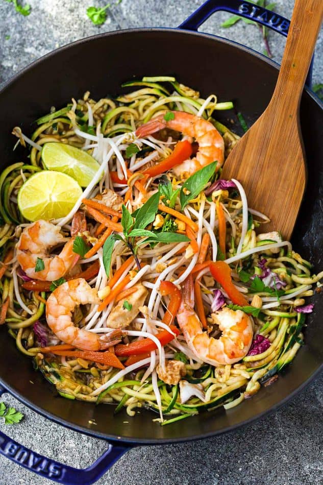 “These Pad Thai Zoodles (Zucchini Noodles) – is the perfect healthy and tasty stir-fry dish to use up that garden zucchini! Low carb, paleo, keto-friendly and Whole30 compliant. Loaded with vegetables, chicken, shrimp and a flavor-packed homemade Pad Thai Sauce that’s the perfect balance of sweet, spicy, and tangy!”. Recipe: LifeMadeSweeter.