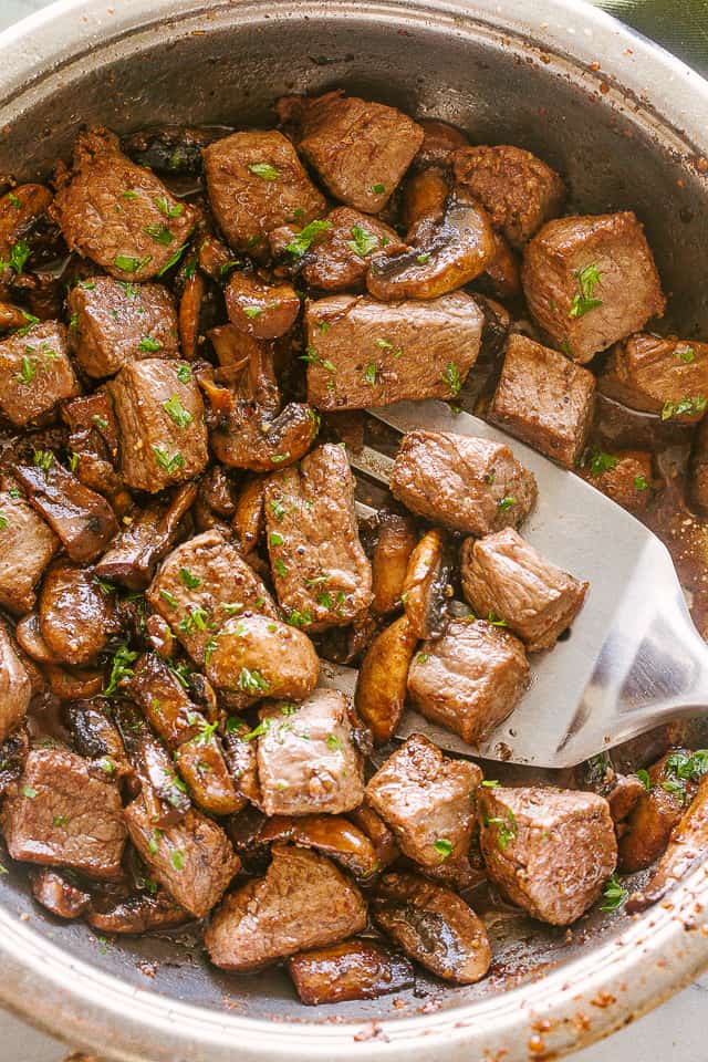 “Garlic Butter Steak Bites with Mushrooms – Juicy Steak Bites with flavorful caramelized mushrooms cooked in a perfectly delicious garlic butter sauce. A one pan recipe that is SO simple to make and it’s ready in under 20 minutes!”. Recipe: DietHood.