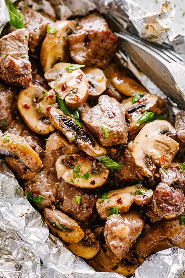 “Steak and Mushrooms Foil Packs – Quick and delicious foil-pack dinner loaded with juicy steak bites and tender mushrooms. Steak and Mushrooms Foil Packs are the perfect quick and easy summer meal!”. Recipe: DietHood.
