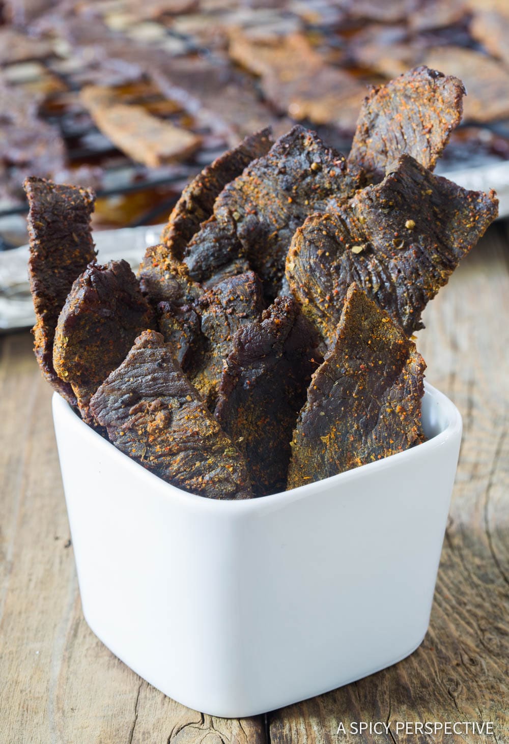 “This Paleo Best Homemade Oven Beef Jerky recipe is packed with flavor and protein, and has the perfect chewable jerky texture! “. Recipe: ASpicyPerspective.